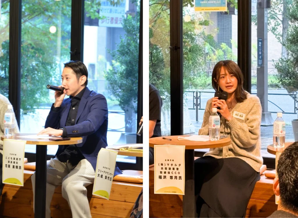 行政からは、こども家庭庁で「こども性暴力防止法(DBS)」施行準備や「こども未来戦略」の取りまとめを担当され、プライベートでは1児の父でもある花房勇輝さま、ワーキングペアレンツ向けサービスを提供する企業の経営者代表として、「こどもが無邪気でいられる社会を創る」というミッションのもと家庭料理のテイクアウトサービスを展開する「マチルダ」共同創業者・取締役CCOの福沢悠月さまをゲストにお迎えしました。