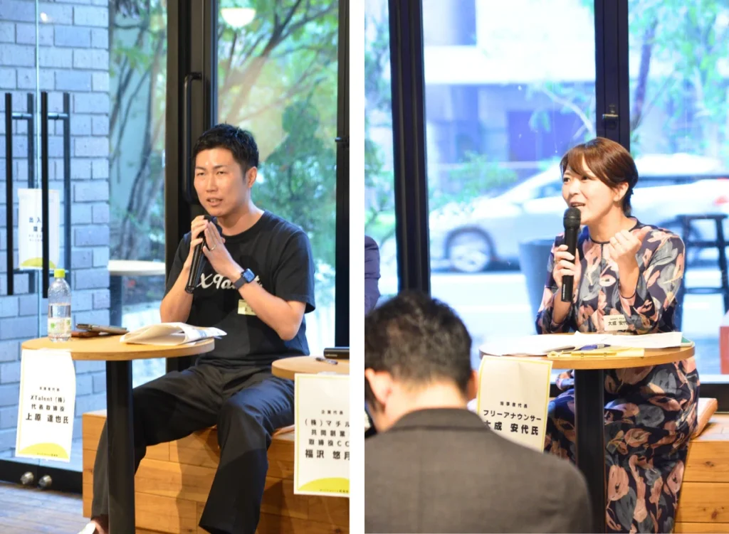 当事者代表 兼 司会を努めてくださったのは、元withworkユーザーでもあり、フリーアナウンサーとしてご活躍されている大成安代さま、そして支援者代表として、withwotkを運営するXTalent株式会社代表の上原が登壇しました。