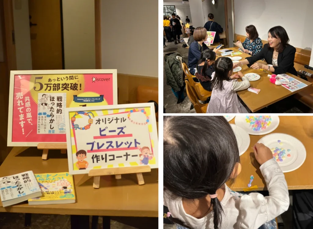 「戦略的ほったらかし教育」や「天才ノート」で知られる岩田かおりさまのブースでは、子どもたちがオリジナルのビーズブレスレットづくりを楽しむ傍ら、大人のみなさまがおうち教育をはじめとした子育て相談を行う、アットホームな空間が広がっていました。
