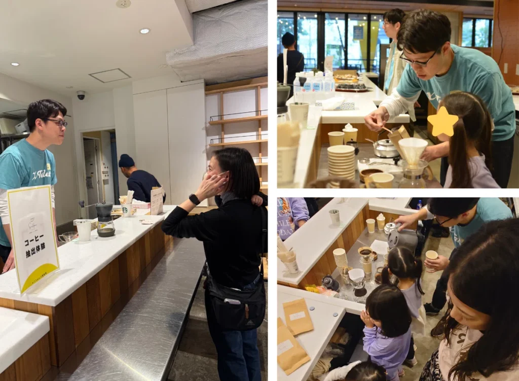 ご協力いただいたのは、ワンダーファイ株式会社さま、seven dotさま、「戦略的ほったらかし教育」の著者であり、wirhworkのインスタライブにもご出演いただいた岩田かおりさま。そして昨年に引き続き、プライベートでコーヒー焙煎所(SacHiare Coffee)を運営するコンサルタント重松が、親子で楽しめるコーヒー抽出体験ブースを担当しました。